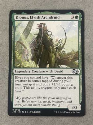 Mana Cost: {3}{G} Total Cost: 4 Type: Legendary Creature — Elf Druid Description: Elves you control have “Whenever this creature becomes tapped during your turn, untap it and put a +1/+1 counter on it. This ability triggers only once each turn.” Power: 3 Toughness: 3 Colors: G